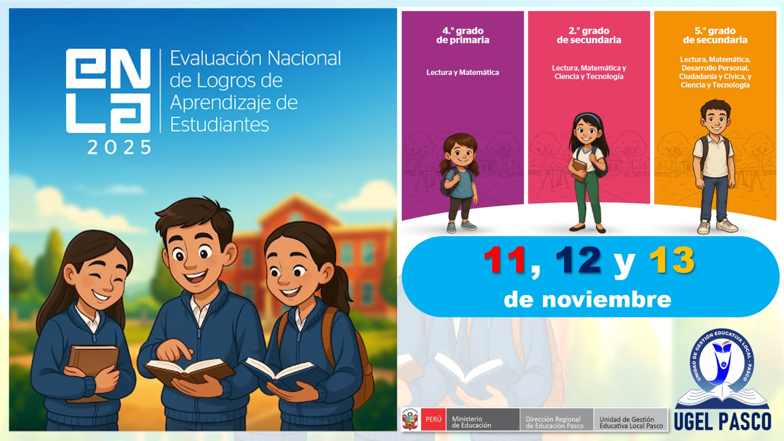 [#ENLA2025] Evaluación Nacional de Logros de Aprendizaje de Estudiante ENLA 2025: 11,12 y 13 de noviembre Participan las instituciones educativas de Educación Básica Regular en los grados y áreas seleccionados: 4.° grado de primaria 2.° grado de secundaria 5.°...