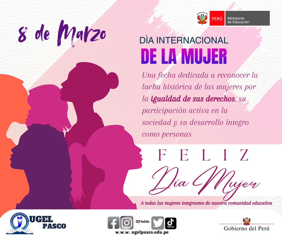 💜La Unidad de Gestión Educativa Local de Pasco se suma a la celebración por el Día Internacional de la Mujer, un día para recordar la luchar por la igualdad, la participación y el empoderamiento de la mujer en todos los ámbitos de la sociedad. 🌸Hacemos extensivo...