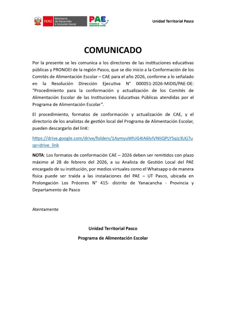 #ComunicadoPAE| El procedimiento, formatos de conformación y actualización de CAE, y el directorio de los analistas de gestión local del Programa de Alimentación Escolar, pueden descargarlo del linK: