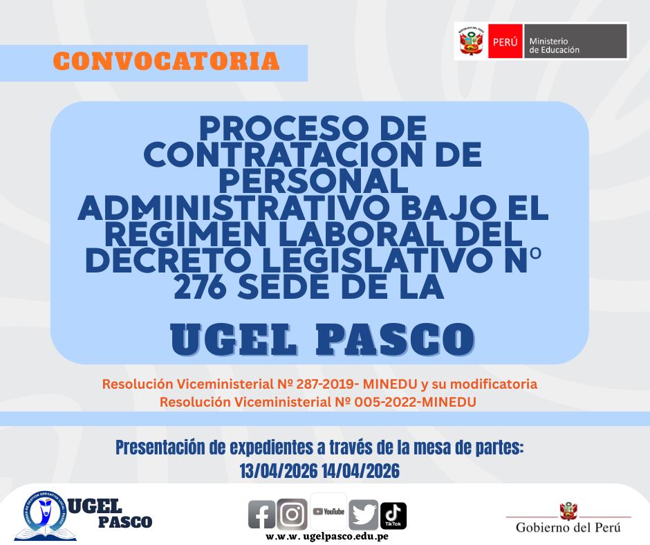 DESCARGAR CONVOCATORIA AQUI. https://ugelpasco.edu.pe/…/2026/03/CONVOCATORIA-276-1.pdf