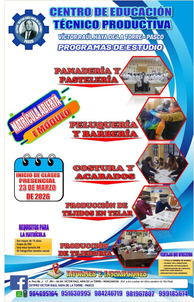 ¡MATRÍCULA ABIERTA 2026! Hoy puedes tomar la decisión que cambie tu historia. En el CETPRO “VICTOR RAUL HAYA DE LA TORRE” DE YANACANCHA creemos que el talento no tiene edad, solo necesita una oportunidad para crecer. PROGRAMAS DE ESTUDIOS COSTURA Y ACABADOS...