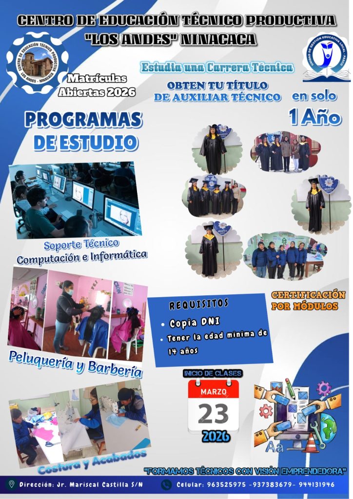 ¡MATRÍCULA ABIERTA 2026! Hoy puedes tomar la decisión que cambie tu historia. En el CETPRO “LOS ANDES” DE NINACACA creemos que el talento no tiene edad, solo necesita una oportunidad para crecer. PROGRAMAS DE ESTUDIOS COSTURA Y ACABADOS PELUQUERIA Y BARBERIA...